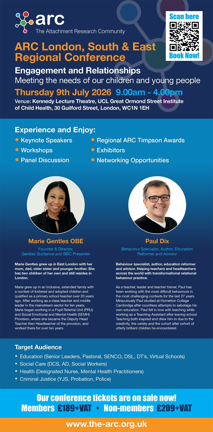 The Attachment Research Community London, South & East Regional Conference: Engagement and Relationships - How can we meet the needs of our children and young people will take place live on Thursday 9th July at Kennedy Lecture Theatre, UCL Great Ormond Street Institute of Child Health, 30 Guildford Street, London, WC1N 1EH